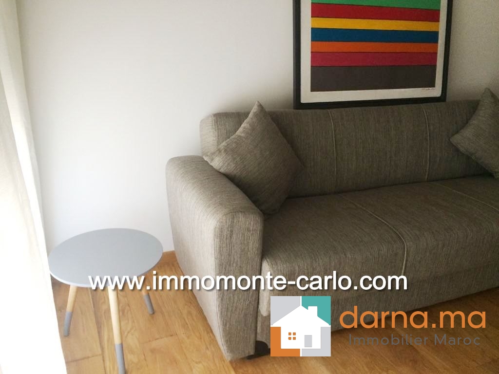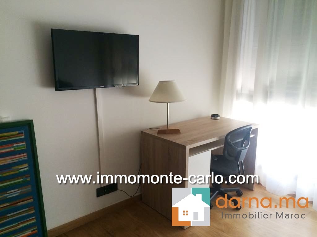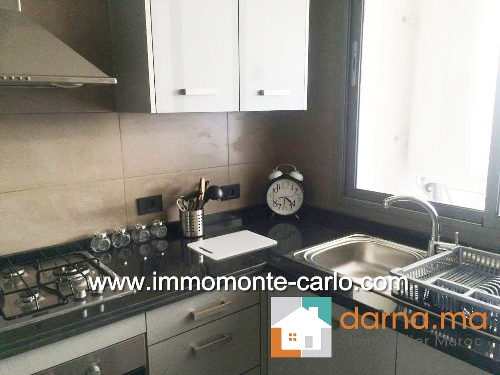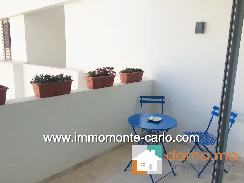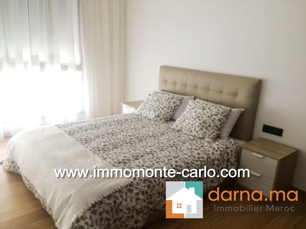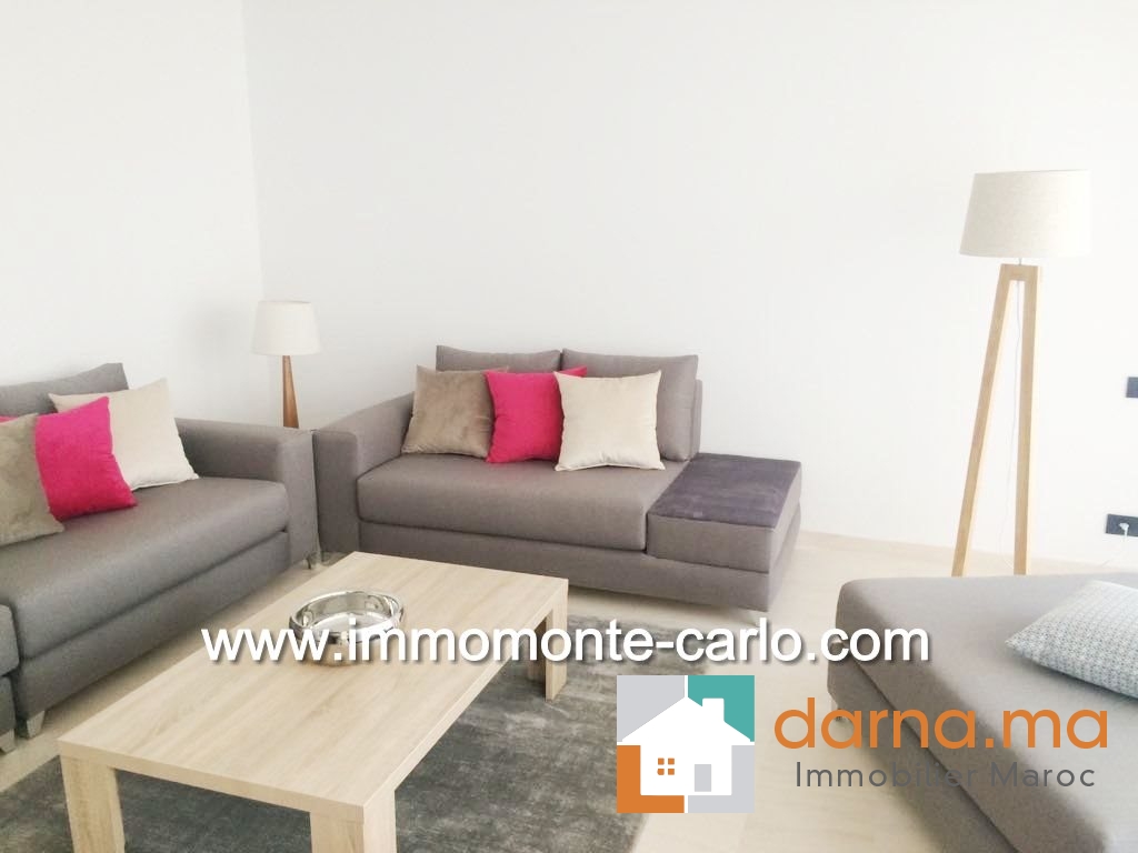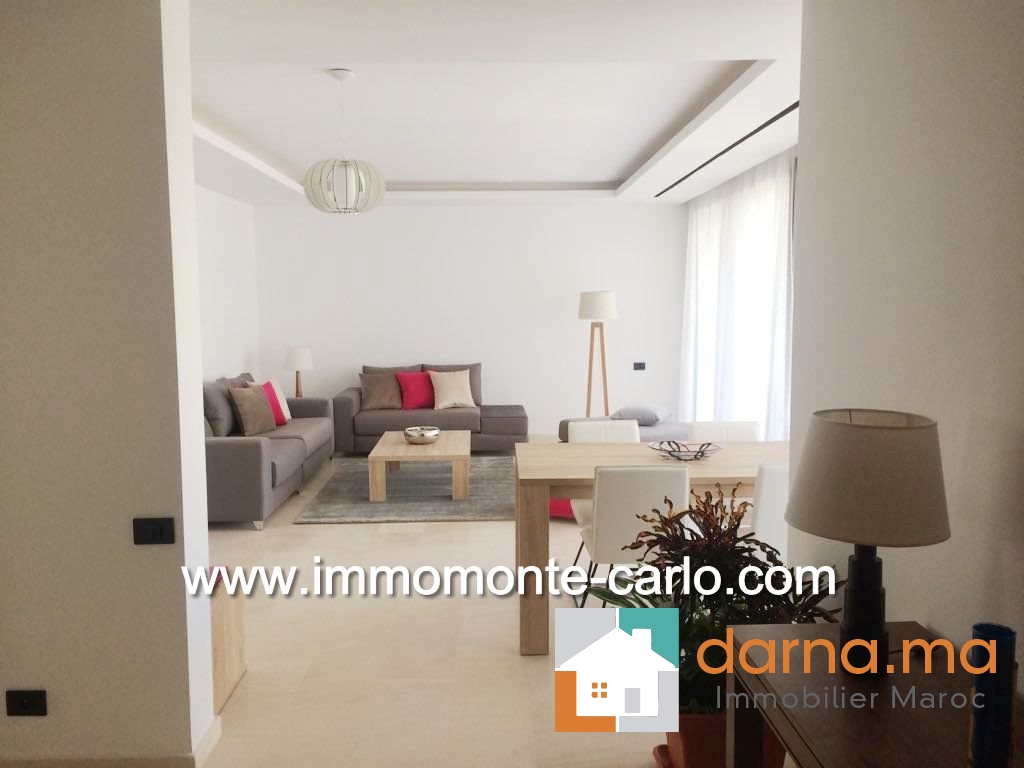 Appartement neuf, haut standing et meublé, d'une superficie de 120 m², situé dans une résidence sécurisée. Il comprend un hall d’entrée, salon européen (TV et table basse comprises), une terrasse donnant sur un jardin privatif de 20 m², une salle à manger, une cuisine équipée avec buanderie, ainsi qu'une chambre à coucher en suite parquetée avec dressing et salle de bain (jacuzzi + robinetterie de haut de gamme). Climatisation centralisée. Immeuble avec parking et ascenseur. ,…