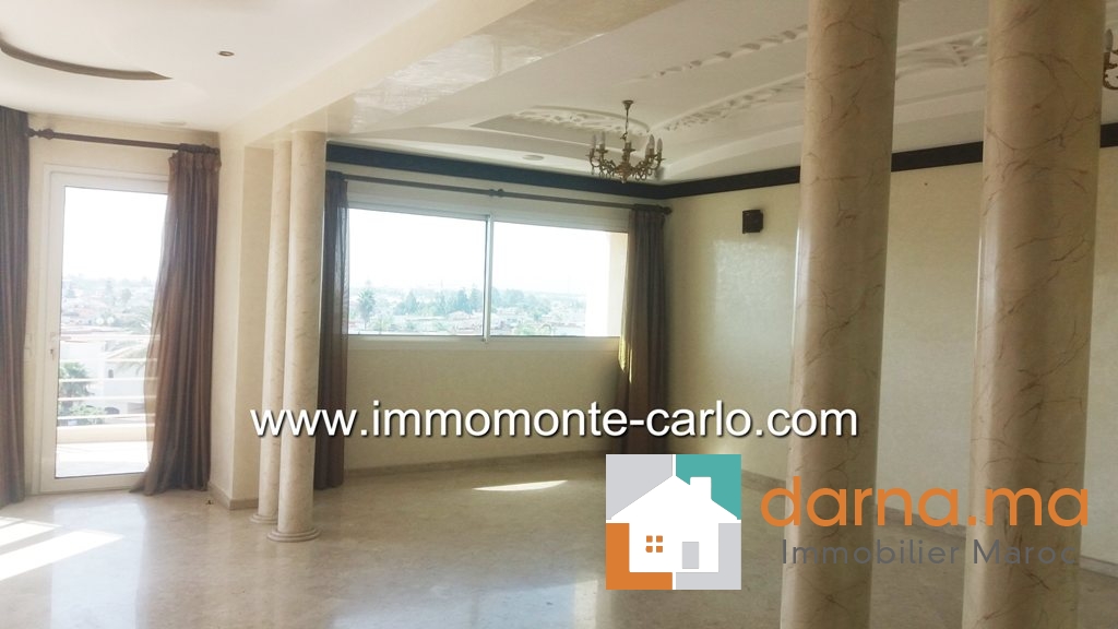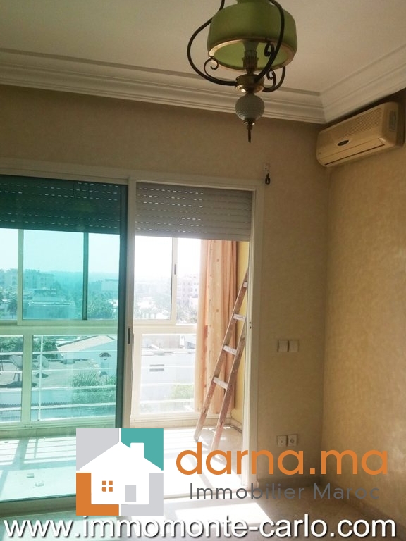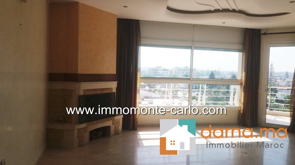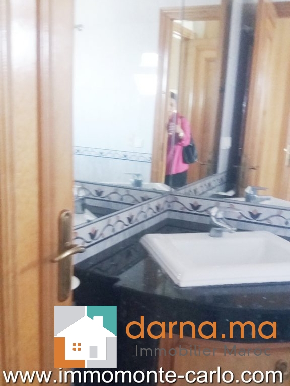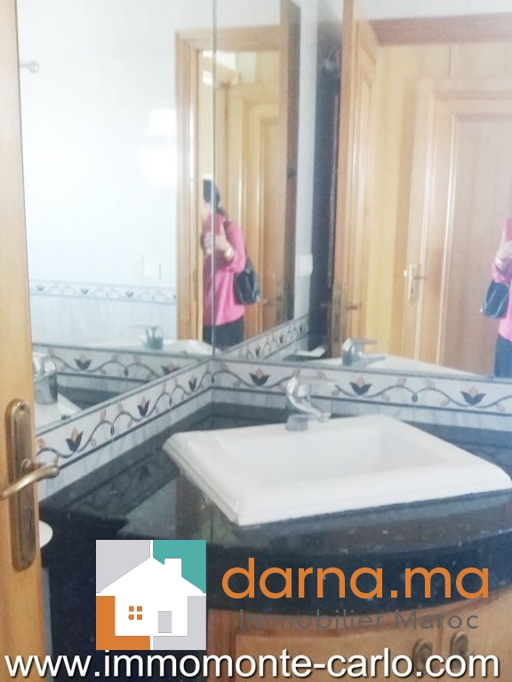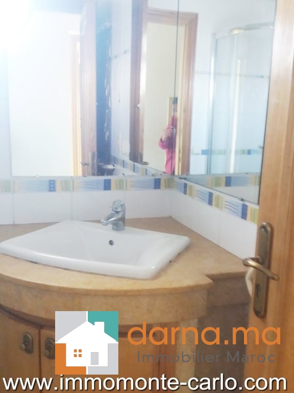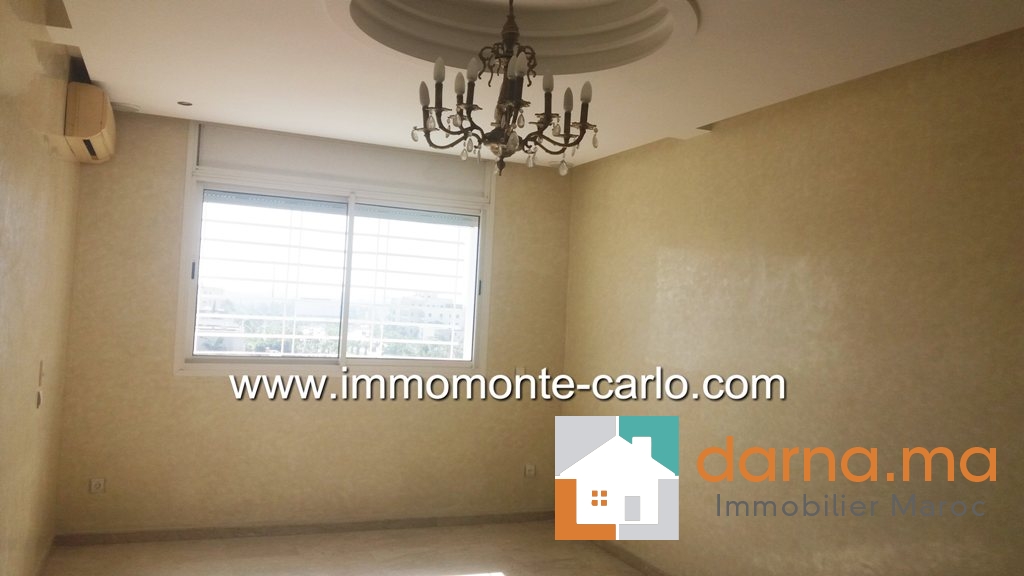 A louer un appartement Hay Riad à Rabat Maroc, avec beaucoup de goût bien ensoleillé et proche de toutes les commodités, il se compose d'un double salon et salle à manger donnant sur une terrasse, une grande cuisine, 4 chambres dont une chambre parentale avec dressing et une salle de bain, 2 salles de bain, L'appartement dispose aussi de: