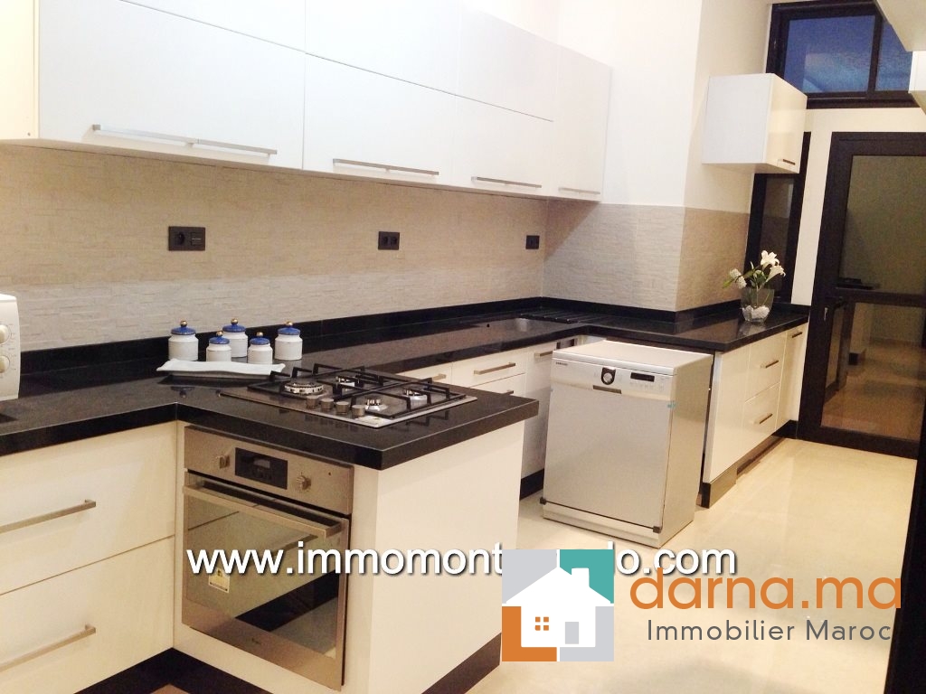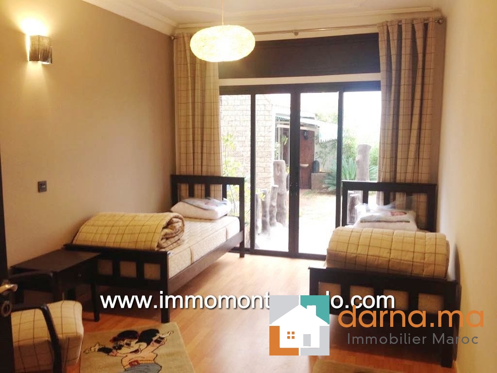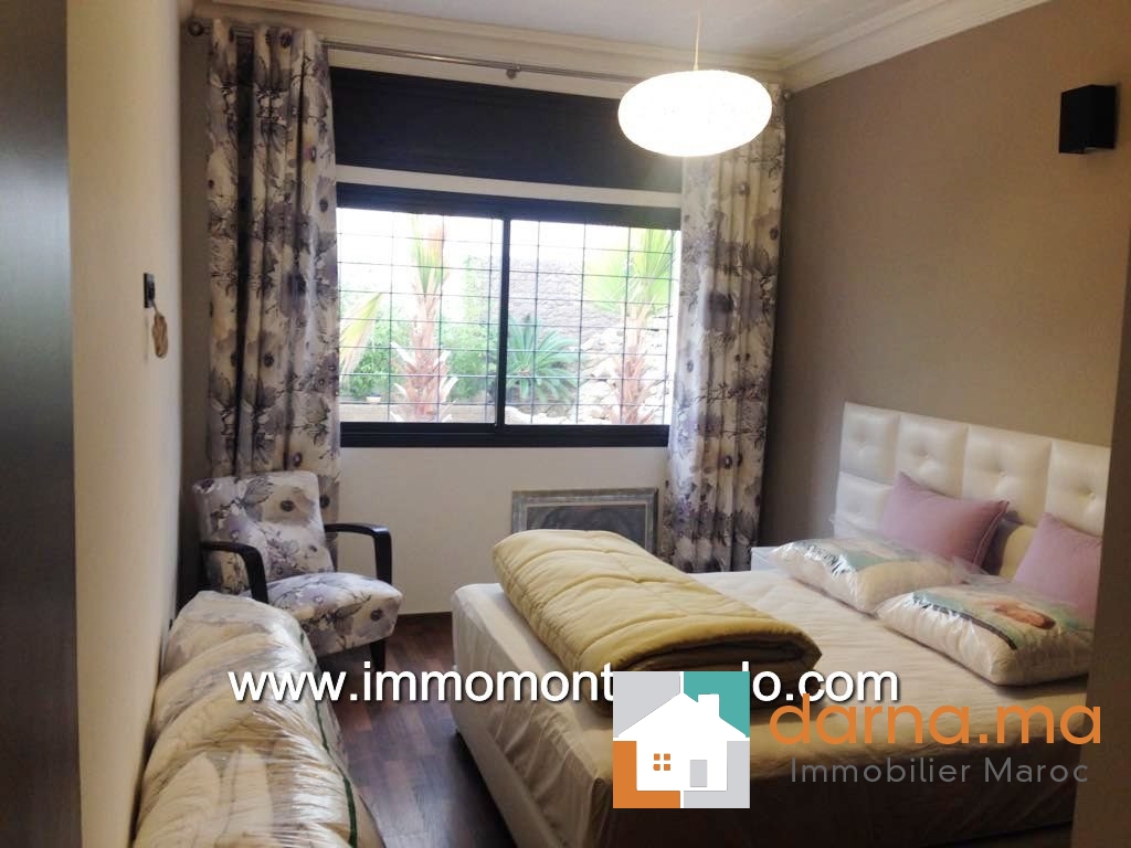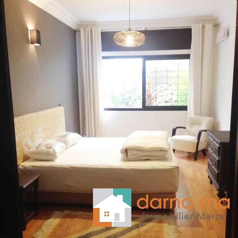 À louer au haut Agdal Rabat Appartement meublé avec beaucoup de goût et entièrement équipé avec un très beau grand jardin aménagé au style japonais avec un salon de jardin, un mélange entre modernité et tradition. Confortable, pratique, idéalement situé dans le côté chic de Rabat Agdal. Proximité dela forêt Hilton, des écoles françaises. Logement moderne et offrant un grand niveau de confort.Il se compose de trois chambres dont une chambre parental avec dressing et salle de bain, deux chambres une avec lit doubles et l’autre avec 2 lits une seule place, salle de bain enfants, 2 salons avec une salle d’eau pour les invités, une très belle cuisine neuve et moderne entièrement équipée.