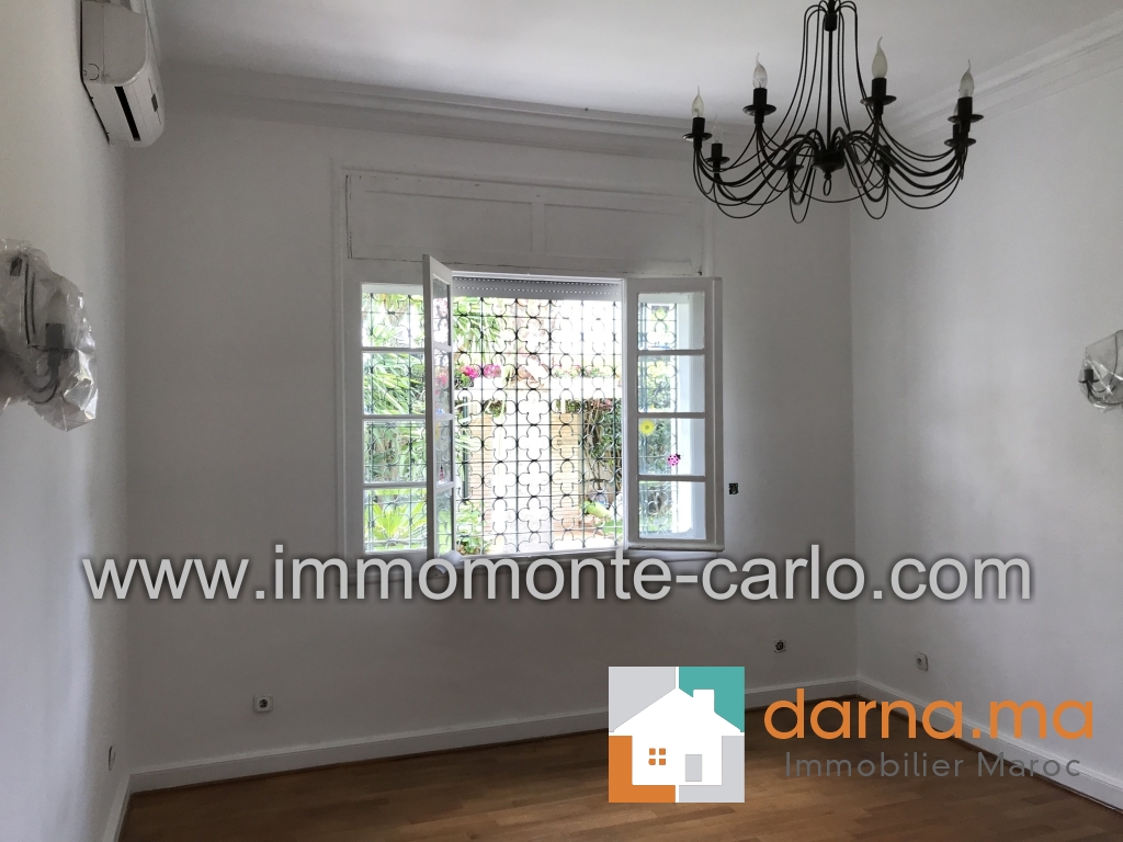 Location villa de plain pied avec un très joli jardin dans un environnement calme et proche de toute commodités, comprenant double salon avec cheminée et une véranda donnant sur le jardin, séjour qui peut être une chambre d’amis, une cuisine, trois chambres dont une chambre parentale composée de 2 pièces, deux salles de bains, un grand garage automatique, jardin avec puit, logement de personnel avec salle de bain, débarras, chambre de gardien avec salle d’eau.